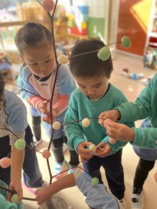 「ミズキ」の赤い枝に子どもたちが好きな場所に団子をつけました。