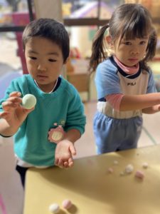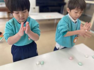 米の粉に色をつけ、繭のように丸めて飾る「繭玉作り」を乳児組・幼児組共に行いました。