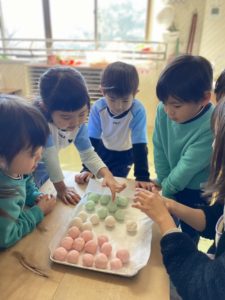 給食室で蒸していただき、色鮮やかな団子が部屋に届くと子どもたちも大喜びです。