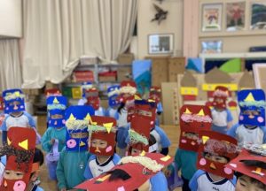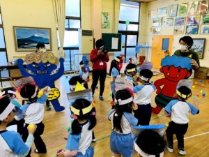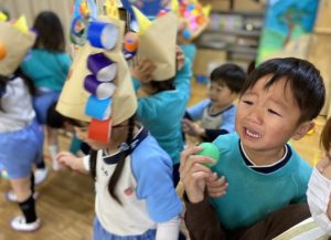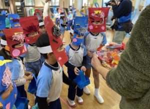 各学年それぞれ作った鬼の面をかぶり、みんな自分の心の中の鬼を追い出すことができたかな?