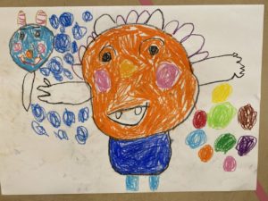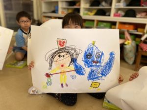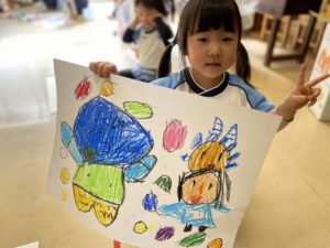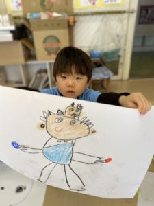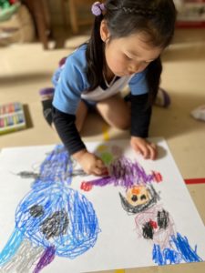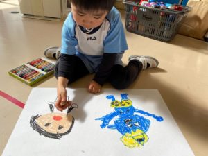 年少さんは、楽しかった豆まきの様子を、クレパスでのびのびと描いていました。