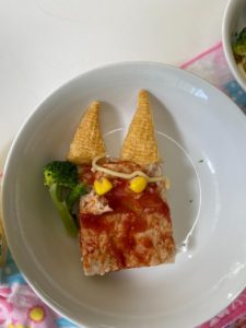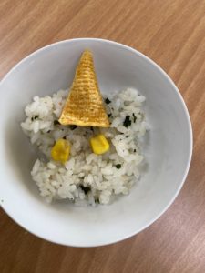 とんがりコーンで鬼の角を作り、様々な食材で髪の毛や顔を作りました。