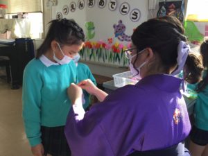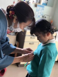 年長担任が一人ひとり、胸に手作りのバッチをつけてくれます。