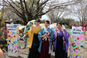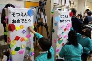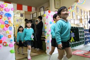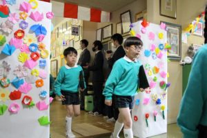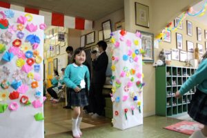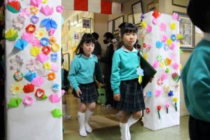 今年度は、ホールで卒園生を待つ間、保護者の皆様に折り紙で花を折ってもらい、貼り付け、素敵な門ができました。ご自宅より花を準備して下さった方もたくさんいて、とても華やかな門が出来上がりました。