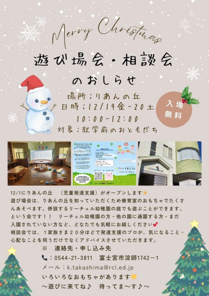 🎅 12/19(金)・20(土) クリスマス遊び場会 療育室のおもちゃや同施設内にある認定こども園リーチェル幼稚園の園庭を開放します! リーチェル幼稚園に入園していない方、他園に通っている方も大歓迎です。遊び場会に参加する場合の予約は特に必要ありません。しかし、相談会に参加希望の方は予約をお願いします。