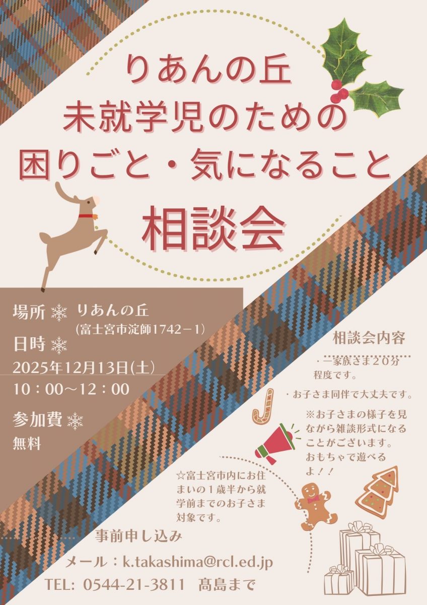 🎅 12/19(金)・20(土) クリスマス遊び場会 療育室のおもちゃや同施設内にある認定こども園リーチェル幼稚園の園庭を開放します! リーチェル幼稚園に入園していない方、他園に通っている方も大歓迎です。遊び場会に参加する場合の予約は特に必要ありません。しかし、相談会に参加希望の方は予約をお願いします。