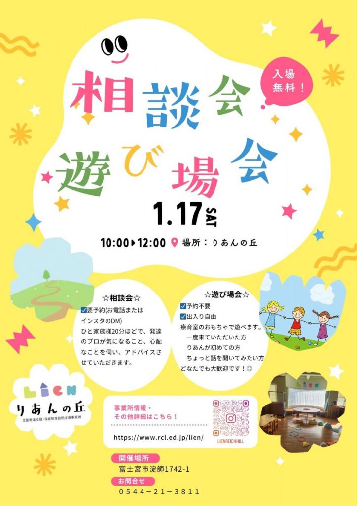 🧸 1/17(土) 困りごと・気になること相談会 ・遊び場会 開催。 相談会は「こんなこと聞いていいのかな?」という小さなことでも大丈夫です✨リーチェル幼稚園に入園していない方、他園に通っている方も大歓迎です。予約が必要ですので、電話、メール、インスタのDM、公式LINEからお問合せください😊遊び場会はどなたでも参加できますので、ぜひ遊びに来てください🌈参加の方は、水分補給用の飲み物をご用意ください。