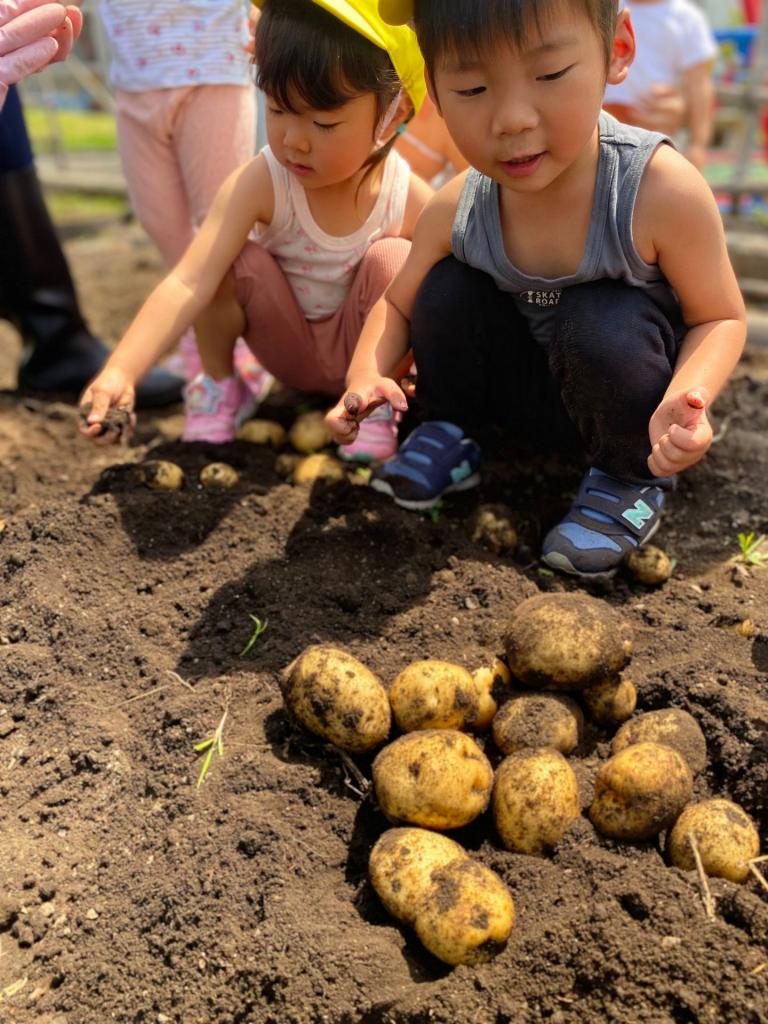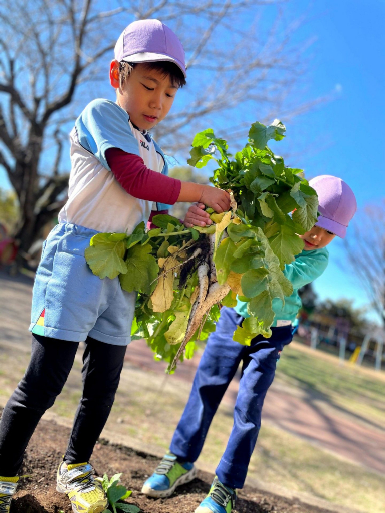 栽培活動では園庭内の畑および園外にあるわんぱく農場の畑を使ってさまざまな野菜を育て、水やり、草取りなどの世話、収穫、そしてみんなで収穫したものを調理し、食べるという、種植えから口に入るまでの一連の体験をする事により、食べ物のありがたみ、苦手な野菜の克服、調理する楽しさ、そしてみんなで食べる楽しさを実体験で経験します。